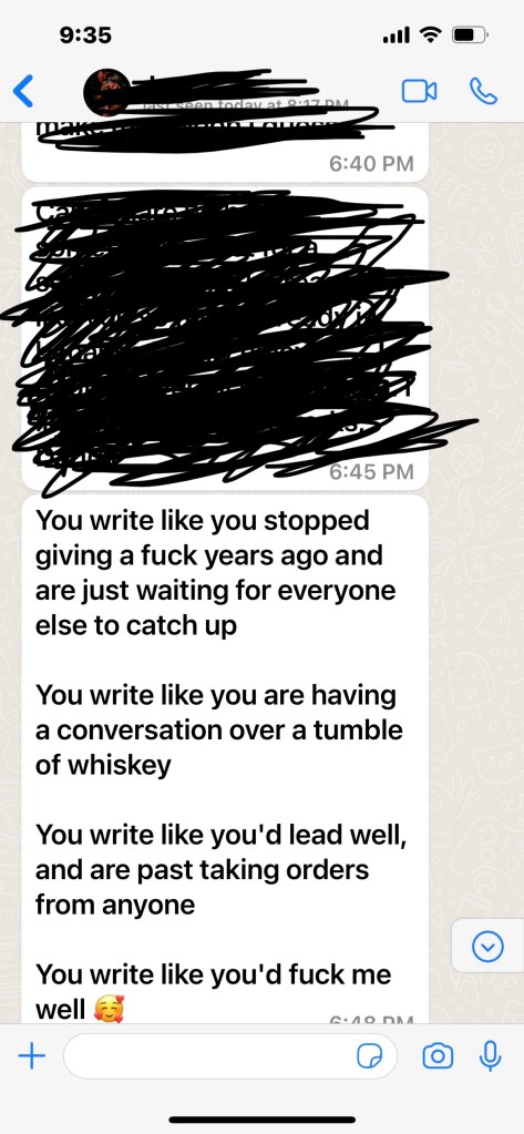 Blue that night, and on some other dates too, I was faced with this snarly question: does what I have to say even matter? Because after all, the very existence of Things Men Carry is premised on man’s innate desire to stay relevant. Here I was a few times this past year, a stuck 50-something wondering should I just put my head down for the remainder and shut the fuck up.