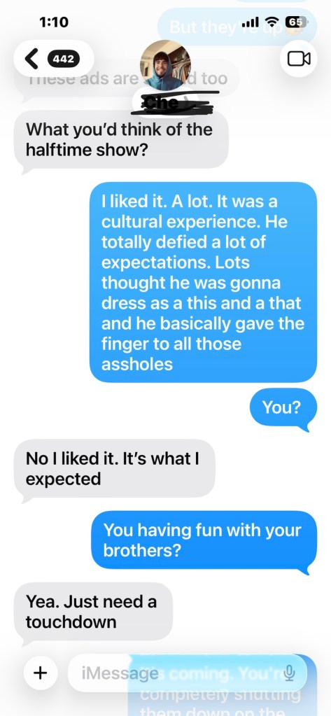 Super Bowl LX pops up. Of all the things my sports-fanatical young blood texts about, it’s Bad Bunny.